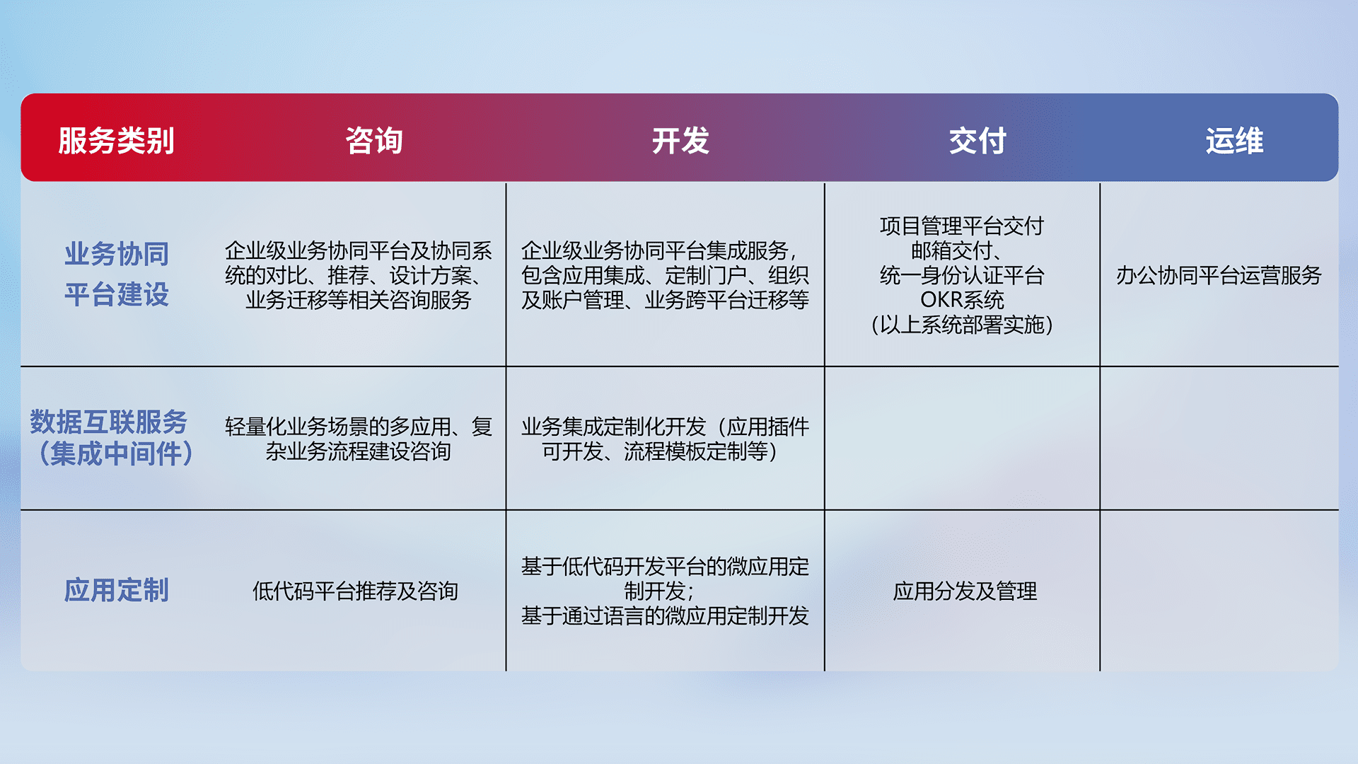 针对钉钉、、企微、、、IDaas等平台级产品提供产品的规划、、、方案、、、、交付、、定制化开发等服务,,,,实现如统一协同办公、、、智能客户服务、、、、混合会议管理、、、智能数据查询、、、等业务场景,,,,实现数字化转型。。
