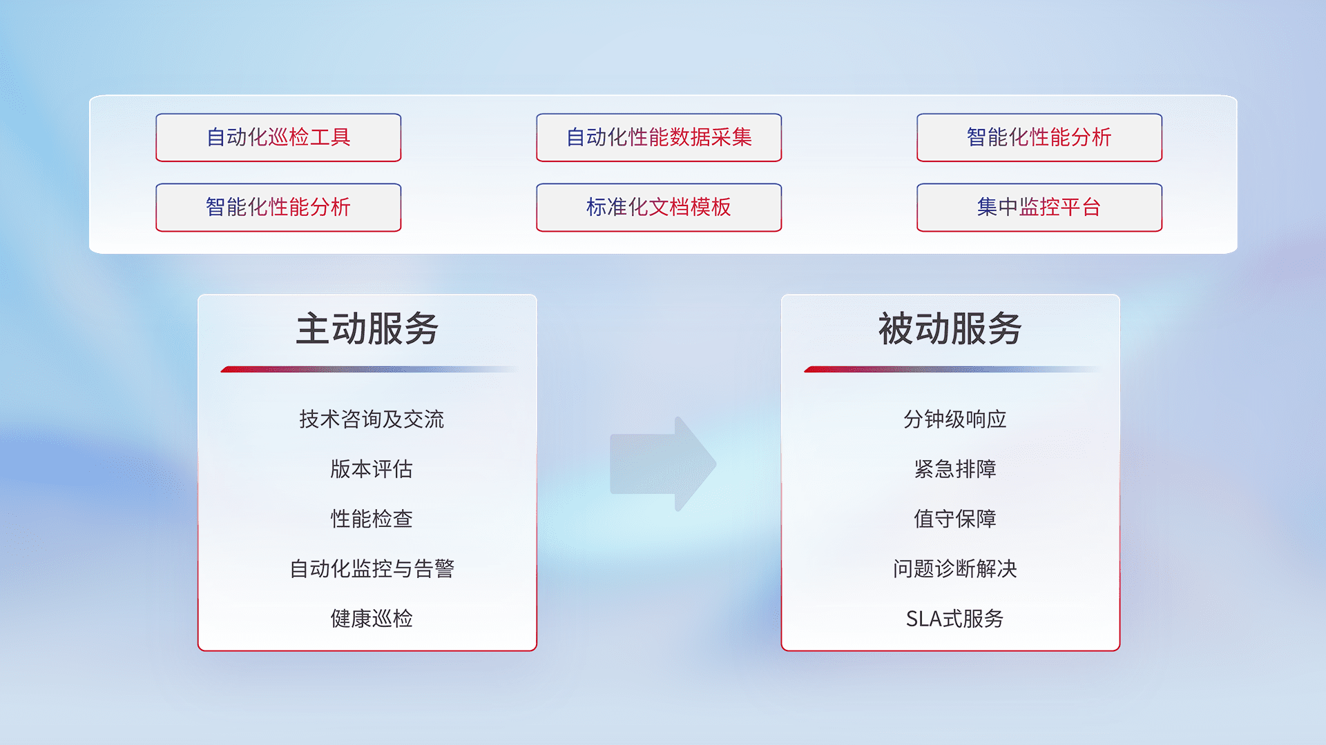 智能化工具和标准化文档,,保障服务质量,,提供主动服务(包含技术咨询、、版本评估、、性能检查、、、、自动化监控与告警、、、健康巡检)和被动服务包含(分钟级响应、、、、紧急排障、、、、值守保障、、、问题诊断解决、、、、SLA服务)。。